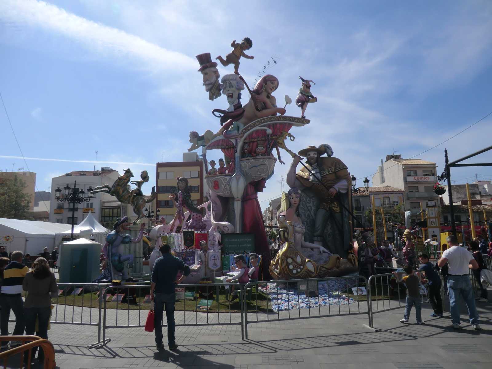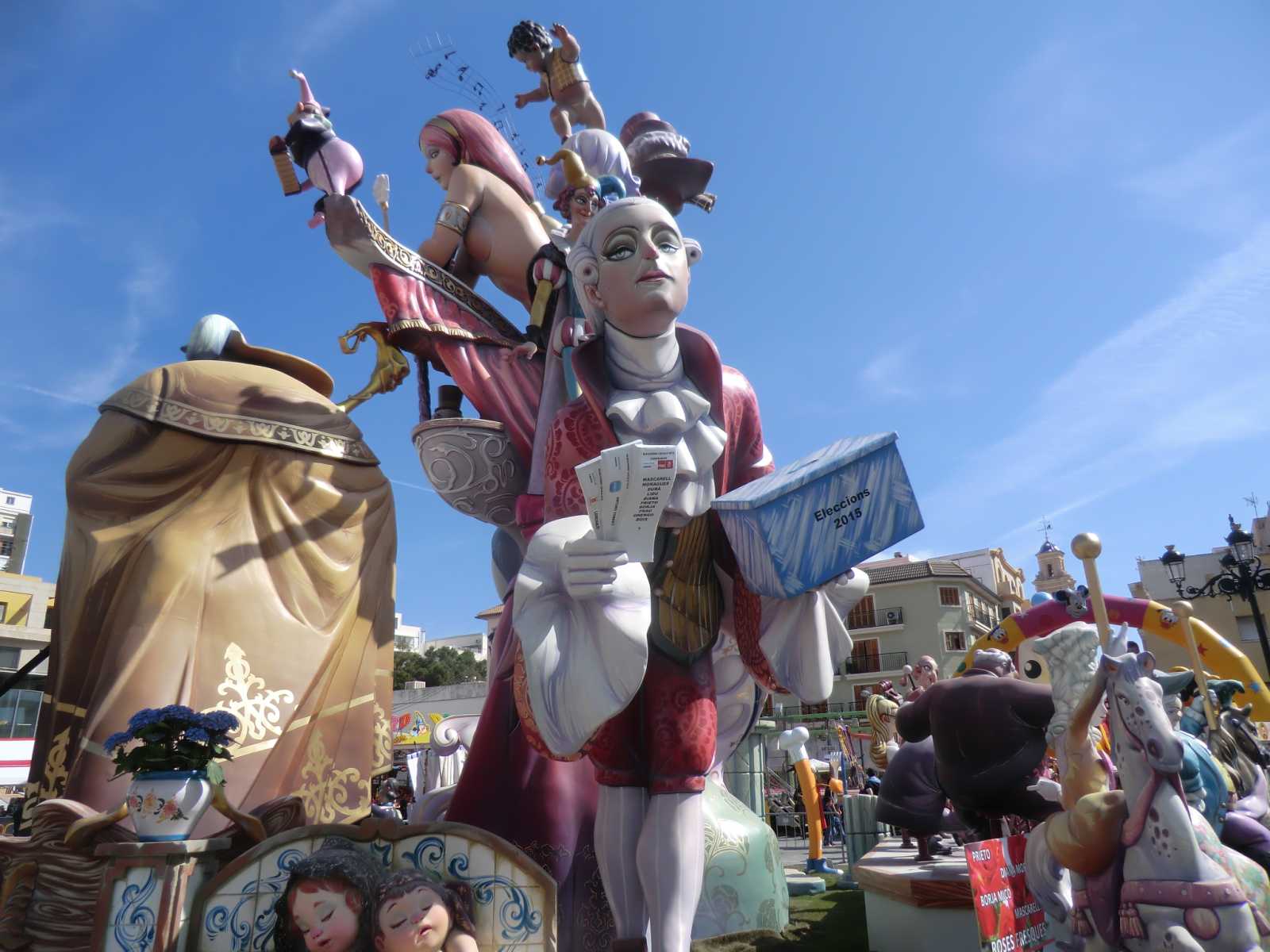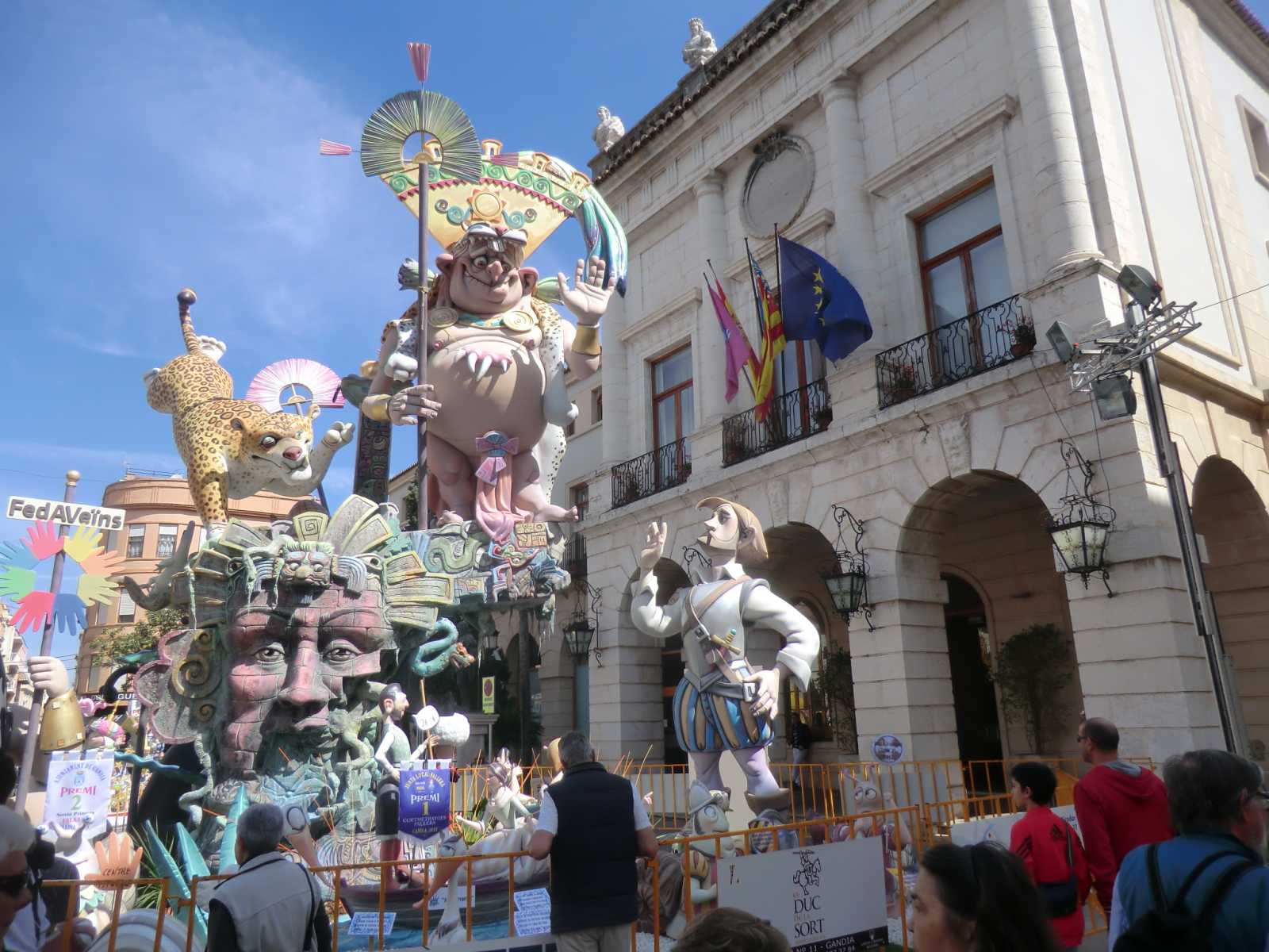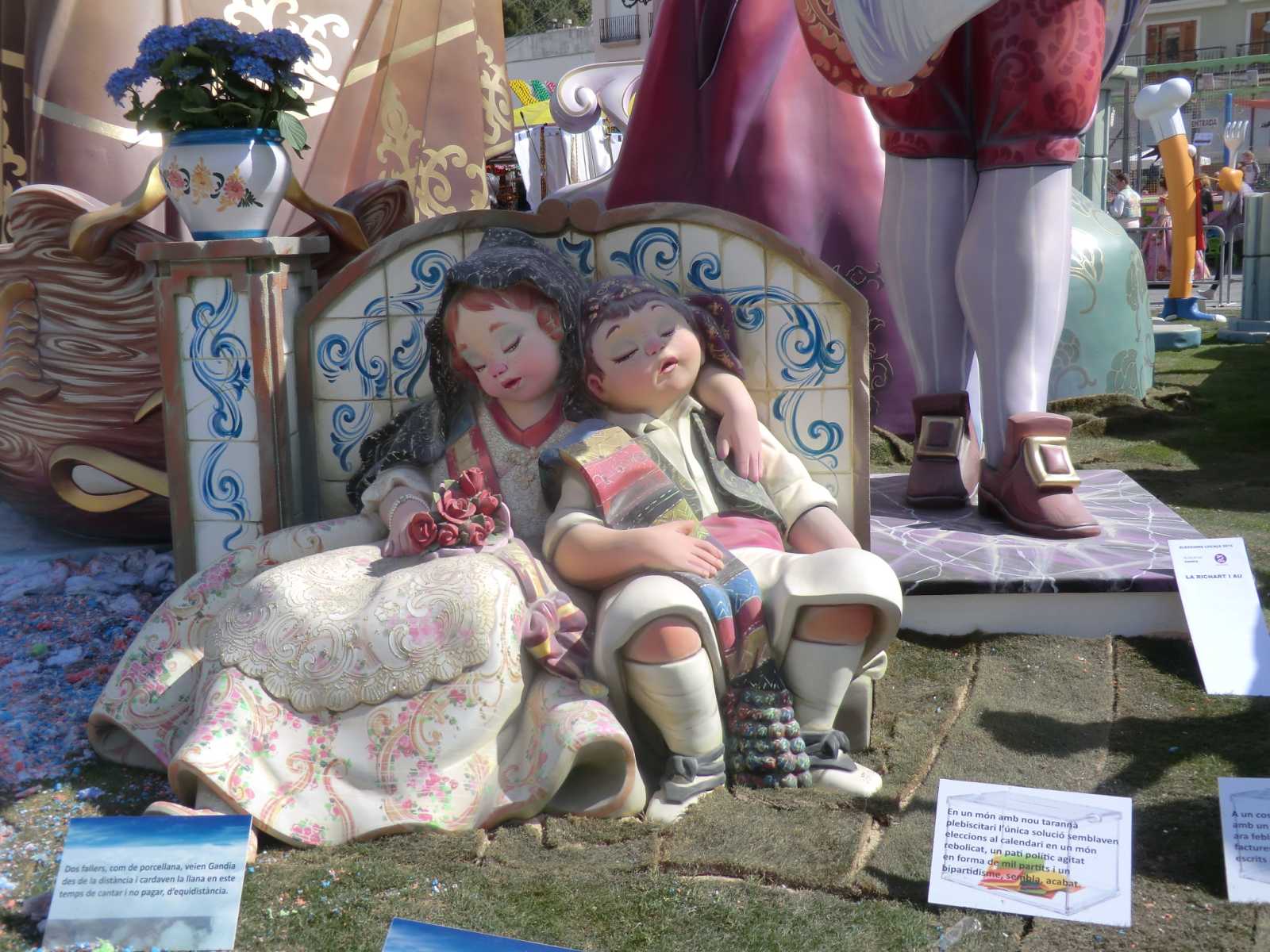 Quite a few months ago we received a booking from Sandy and David who wanted to stay in our self-catering apartment for nearly a fortnight, to coincide with the local fiesta of Gandia Las Fallas 2014. Las Fallas is the famous Valencian fiesta which sees enormous satirical effigies constructed in each town (or in each area of larger towns). These are then judged on their merits and finally burned to the ground on the night of March 19th – St Joseph’s Day, the patron saint of carpenters. In the run-up to March 19th there are daily parades with marching bands and local ladies and young girls bedecked in the most elaborate of traditional dress.